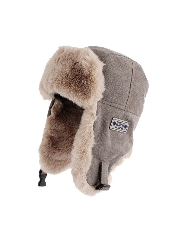 GRAY FAUX FUR TRAPPER HAT WITH VINTAGE PATCH FOR WINTER WARMTH
