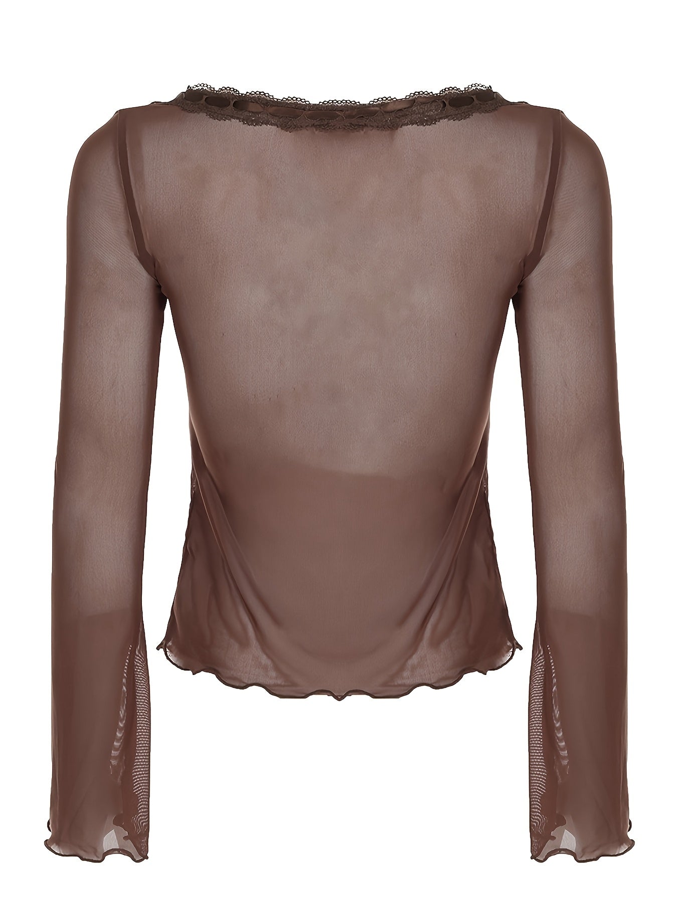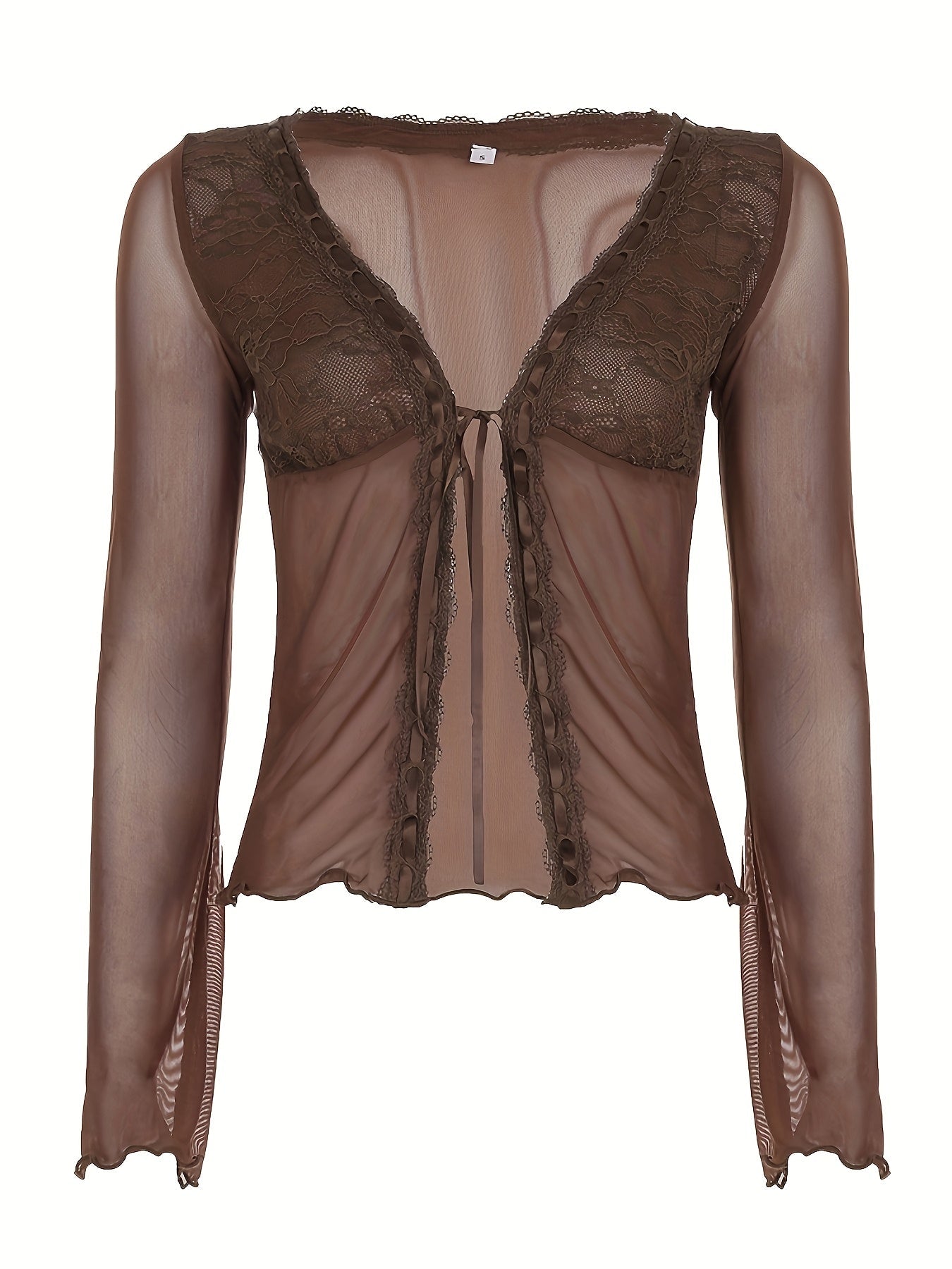 BROWN SHEER TIE-FRONT TOP LONG SLEEVE VINTAGE