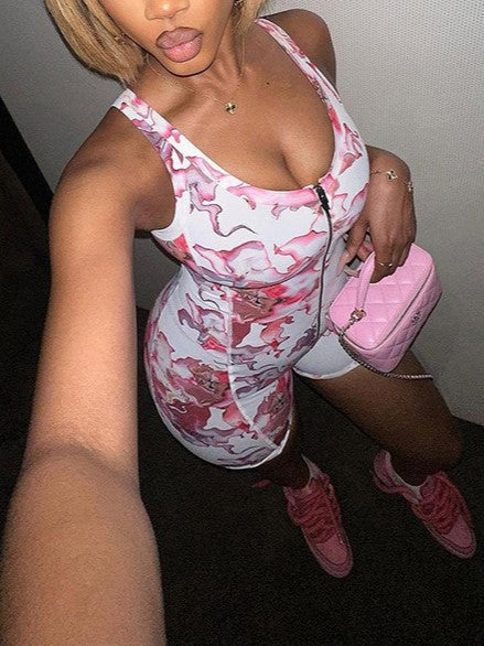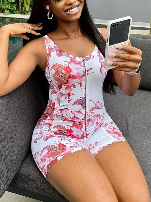 Vintage Print Zipper Sleeveless Slim Fit Overalls — A Timeless Elegance